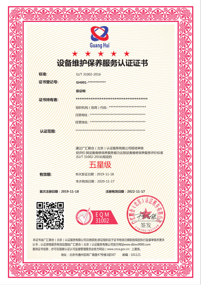 设备维护保养服务认证是依据SJ/T 31002-2016 企业设备维修保养通则而实施的认证。《SJ/T 31002-2016企业设备维护保养通则》及《设备维护保养服务认证实施规则》进行评价。SJ/T 31002-2016标准适用于电子行业企业和实业单位的通用机械设备、专用设备、动力设备、电气设备,其他设备也可参照执行。 组织可申请设备维护保养服务认证,以此作为组织已满足市场对于企业设备维护保养服务要求的证明设备维修保养服务认证是依据SJ/T 31002-2016 企业设备维修保养通则而实施的认证。《SJ/T 31002-2016 企业设备维护保养通则》及《设备维护保养服务认证 实施规则》进行评价。SJ/T 31002-2016标准适用于电子行业企业和实业单位的通用机械设备、专用设备、动力设备、电气设备,其他设备也可参照执行。