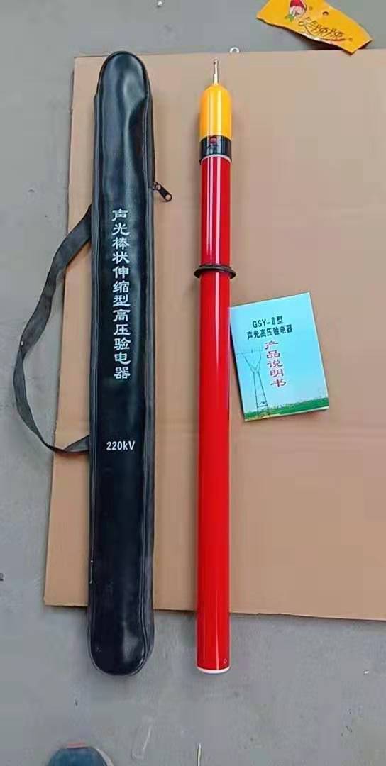 (二)验电前应对验电器进行自检试验,使用时须同时按住自检导电金属开关和触电探针,验电指示器发出间歇振荡声光讯号,则证明验电器性能完好,即可进行验电,此时可将伸缩绝缘杆拉开进行验电操作,手不能超过规定的安全环,验电器触头与等级的带电体触示,即可发出间歇声光讯号表示有电,否则表示无电。
