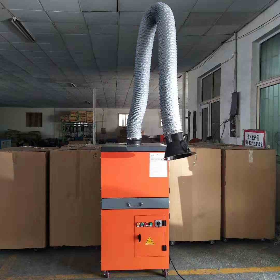 移动式单双臂焊烟净化器处理焊接烟雾废气效果烟尘、烟雾通过焊烟净化器产生的负压由吸气罩吸入烟尘,经柔性吸气臂进入腔体,流速变慢使大颗粒直径的粉尘掉落下来,含微细粉尘的气流进入净化室内,粉尘的过滤分离在净化室内通过滤筒的分离作用完成,烟尘则被滤芯阻拦在其表面上,净化后的空气经风机排出,当被阻拦的烟尘在滤芯表面不断沉积时,定时将滤筒取出手工清理。
