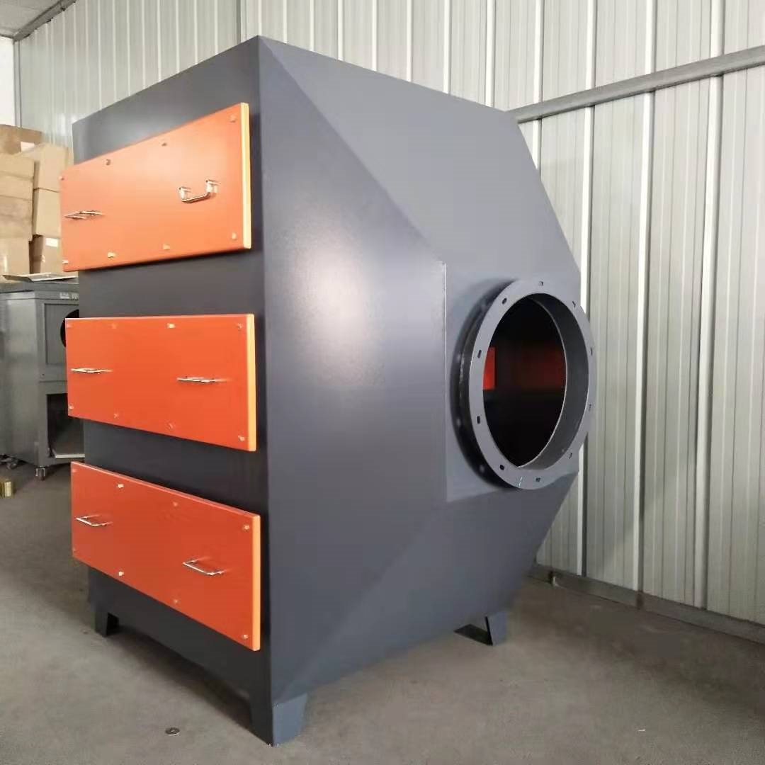 当废气由风机提供动力,负压进入吸附箱后进入活性炭吸附层,由于活性炭吸附剂表面上存在着未平衡和未饱和的分子引力或化学键力,因此当活性炭吸附剂的表面与气体接触时,就能吸引气体分子,使其浓聚并保持在活性炭表面,此现象称为吸附。利用活性炭吸附剂表面的吸附能力,使废气与大表面的多孔性活性炭吸附剂相接触,废气中的污染物被吸附在活性炭表面上,使其与气体分离,净化后的气体高空排放。 活性炭吸附箱是一种干式废气处理设备,由箱体和填装在箱内吸附单元组成