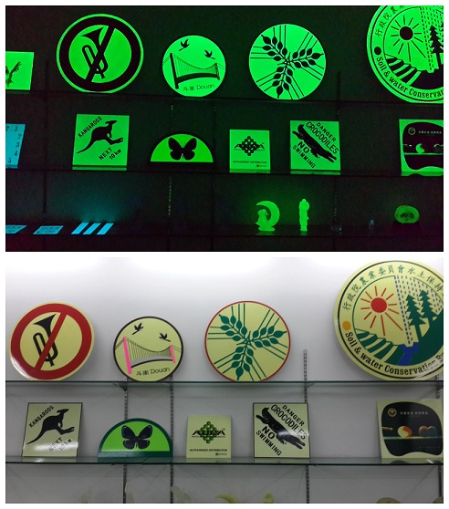 克力及其它塑料材料等作为载体,配以色漆、油墨,以喷涂或印刷的 方式附于基材上制作成标志牌使用,它具有安装简单、无需通电、无放射性、免维护等特点。