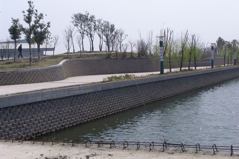 生态挡墙就是长2米、宽1米、高50厘米的混凝土“盒子”,相互串联在一起,用螺栓相互连接,上下摆放整齐,“盒子”中再填满石块。生态挡墙施工完成后,岸上雨水过滤后,通过土工布进入渠道,渠道两边“阶梯式”生态挡墙孔洞内还可以种上水生植物,净化水质,给水下的鱼、虾等生物预留生存的空间,真正达到生态与环保的自然效果。广泛应用于黑臭水体治理、农业灌溉、生态修复、水利交通等领域。