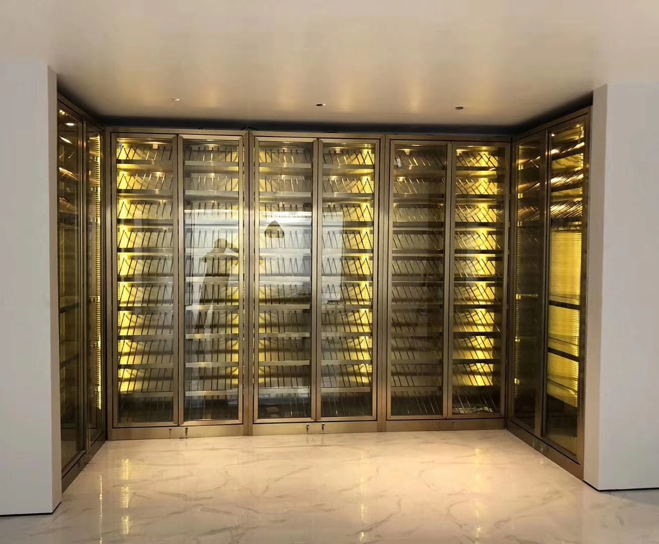 温装置,非常适合一些私人别墅或者不需要太苛刻的储存条件的红酒存放。加工方式主要是不锈钢管材的焊接、板材的刨槽折弯加工而成。每层拜访红酒的架子,其实也是通过