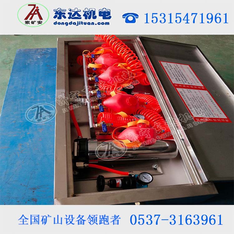ZYJ-M6压风自救装置一箱六组(可根据要求设计组别),能同时提供六人使用,达到互相照顾的效果。该装置由箱体、安装板、进气管、进水管、净水过滤器、门锁、呼吸器(多组)、排水装置(多组)等组成。箱体、安装板、总进气管、总进水管采用不锈钢制造而成。