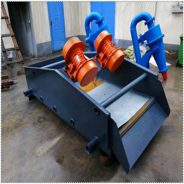 细砂回收机细砂回收机主要由电机、真空高压泵、泥沙分离器、振动脱水筛、清洗槽、返料箱等部件组成,主要是对洗砂机工作中产生的洗沙废水中的细沙进行回收脱水作业。细砂回收机在工作时,洗砂废水输送至设备的清洗箱中,而后通过渣浆泵将清洗箱中的砂水混合物输送至旋流器中,通过旋流器离心分离,浓缩的细砂经出料箱供给振动脱水筛,经振动脱水筛脱水,细砂由筛前输出。而少量的细砂、泥浆等则经返料箱再回到清洗槽,循环往复,从而实现对洗砂废水中的细沙回收、脱水、干排的目的。