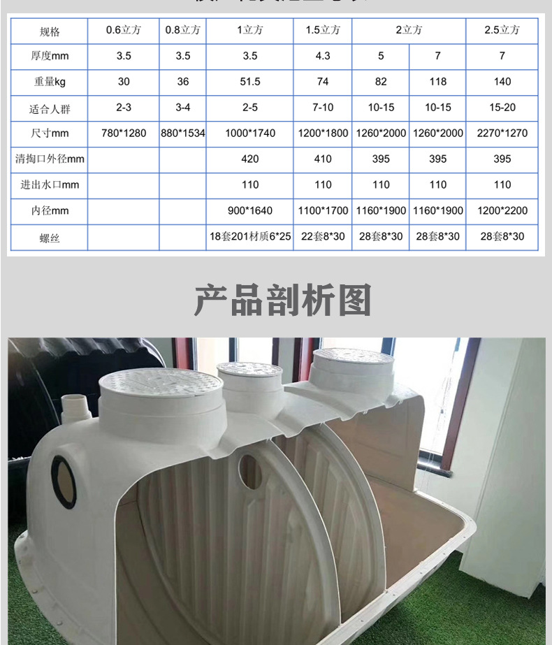 玻璃钢化粪池采用整体形生产,密封性能好,不渗漏,不污染地表水,不腐蚀化粪池周边的花草树木,电线电缆。池内采用高位虹吸导疏,多次沉淀,多次净化。