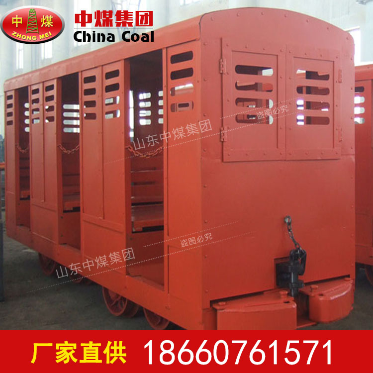 平巷人车车箱有前后端板和金属顶棚,车厢外部钢板使用2mm厚的钢板,内部使用0.5mm厚的不锈钢板做车棚,车身下部使用黄色瓷漆,上部使用蓝色瓷漆。车身呈流线型,车棚采用厚方管做骨架。车厢底板采用花纹钢板,底盘刷防锈漆。安装高强度塑钢车椅,每车12座。车体外部两侧需安装指示灯(LED防爆型),每车不得少于6盏(一车一直流电源)。开式轮对使用圆锥滚柱轴承(30310型);碰头材质为聚胺脂,安装形式为矿车单头式;联接器采用闭锁结构,转向器、联接器和碰头采用弹簧减震。
