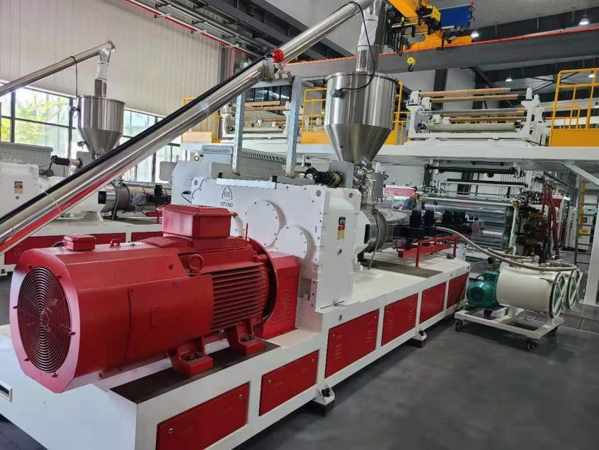(使车间无灰尘)、再自动上料到螺杆挤出机、由大板模具结构出料进行五辊定型模定型排辊托架冷却装置、裁边装置、牵引