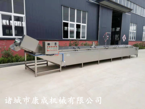 牡丹江毛豆荚漂烫机 芋头漂烫机 蒸煮漂烫机整机304不锈钢制作,漂烫机集热烫、冷却于一体,无压操作,安全可靠。该机具有快速杀青,抑酶护色及时脱水冷却,一次完成之特点,使果蔬保持原有的自然色泽。能保持果蔬特有的鲜活色泽,散发蔬菜的青臭气并保留香味,增进细胞的柔软性,利于水份蒸发,为下道烘干脱水工序的工艺要求奠定良好的基础。主要用于果实、根茎类蔬菜及胡萝卜、芦笋、蘑菇、水果片等易碎产品的漂烫杀青,是速冻、脱水、冻干等预处理加工不可缺少的漂烫设备。主体全部采用SUS304不锈钢和食品级UPE材料制作,符合食品加工标准,干净卫生;输送采用冲孔板式不锈钢输送带,回带采用外置结构,卫生易于清洁;本机设计了压料轮,压料轮能将悬浮物料压入热水中确保物料充分加热,尤其适用叶类、丝类、丁类等物料;主机输送板带配有变频器,物料漂烫时间可调整到较佳状态,适用各种果蔬。