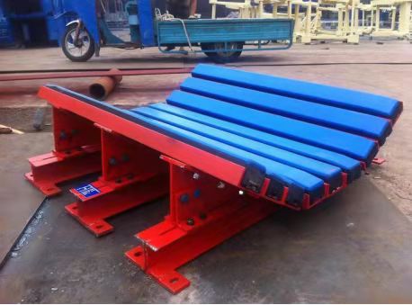 缓冲床主要用于替代缓冲托辊,缓冲床由缓冲条组成,而缓冲条主要应用优良的高弹性特种橡胶层充分有效吸收了物料下落时的冲击力,大大降低了物料下落时对输送带的冲击,真正的改善了落料点的受力状况。并采用特殊的UHMW高分子聚乙烯表面,使输送带与缓冲条之间的摩擦系数降到较低,且耐磨性好。缓冲床的使用保证了输送带的面与面的接触,受力均匀,有效防止了由于托辊断裂、脱落造成的皮带纵向撕裂,同时大大降低了皮带被锐器或尖锐物料穿透后纵向撕裂的概率。