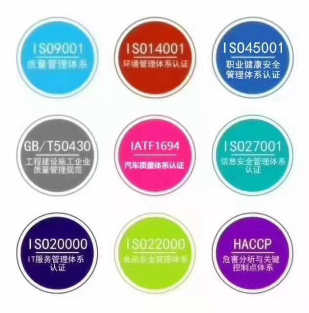 1、ISO体系认证类——ISO9001质量认证、ISO14001环境认证、ISO45001职业健康安全认证、《ISO22000食品安全认证》、《HACCP认证》、《绿色食品安全认证》、《绿色供应链认证》、《垃圾分类等级认证》、《物业服务认证》、《保安服务认证》、《餐饮服务认证》、《餐饮企业现场管理评价认证》、《清洁服务认证》、《售后服务认证(五星)》、《有害生物防制服务能力评价认证》、《生鲜农产品供应商服务规范认证》等;