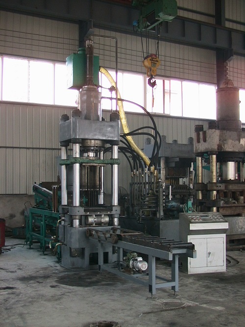我公司是生产液压设备的专业公司,有着多年的生产经验和专业设备,本机为四立柱式液压机,采用先进的液压系统,通过PLC 可编程序和OP文本显示人机介面的调整来实现自动控制,完整的动作,精确的定位,巨大的压力,把不同的铁粉、氧化铁皮等原材料,通过不同的颗粒配比,更换不同的模具,压制成标准和非标准的实心和空芯形块,是中小型压块企业在生产过程中理想的压块成型设备。