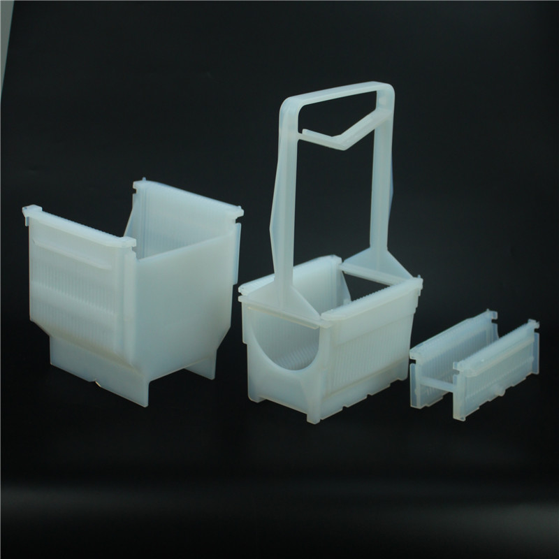 PFA花篮(PFA wafer Cassette) 又名 清洗花蓝铁氟龙卡匣铁氟龙晶舟盒铁氟龙晶圆盒为承载半导体晶圆片/硅片的容器,耐酸耐碱耐腐蚀(强酸、强氟酸、强碱),主要用于半导体蚀刻部门之酸碱制程中使用、传送晶圆。我司PFA花篮,进入化学酸、碱蚀刻制程中,可搭配PFA把手使用。