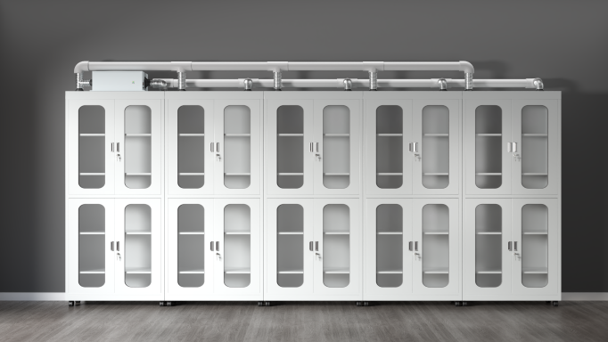 消毒净气(净化)器械柜药品柜配置:可以一柜一消毒净化器,也可多柜共用一台消毒净化器(通过柜顶管道连接)。