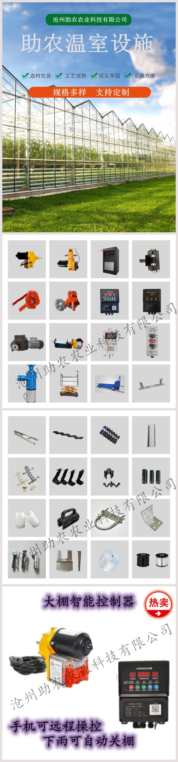 生产、销售温室大棚配件电动卷膜器,手动卷膜器,大棚骨架,智能放风系统,电动卷膜器适配温控仪,电动卷膜器电源,电动卷膜器开关,电动卷膜器爬升器,保温被,卷帘机,温室骨架,卡槽,卡簧,压膜卡,固定卡,连接管,压顶簧,压膜绳