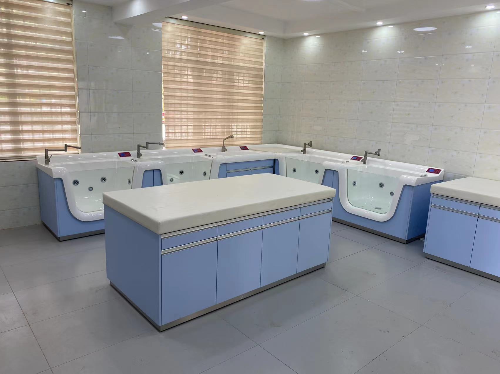 婴儿洗浴中心由婴儿洗礼池,婴儿游泳池,护理平台,抚触软包台,洗手池等组成。洗礼池和游泳池,洗手池,护理平台,转角平台都采用面层为A级PMMA高分子复合材料一体成型,表面细菌残留量远远低于不锈钢,人造石,陶瓷盆和其他普通塑料。婴儿洗澡池底部圆滑突起设计;给婴儿一防滑支撑点,防止婴儿在池内滑动,造成意外呛水。