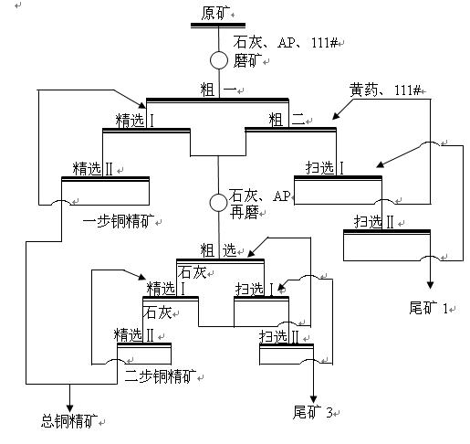 (2)优先浮选铜硫矿。一般是先浮铜,再浮硫。致密块状含铜黄铁矿,常采用高碱度(游离Ca0含量为600-800g/rr13)、高黄药用量的方法浮铜抑制黄铁矿。其尾矿中主要是黄铁矿,脉石很少,所以尾矿就是硫精矿。对于浸染状铜硫矿石,采用优先浮选流程,浮铜后的尾矿要再浮硫,为了降低浮硫时硫酸的消耗及保证安全操作,浮铜时,尽量采用低碱度的工艺条件。