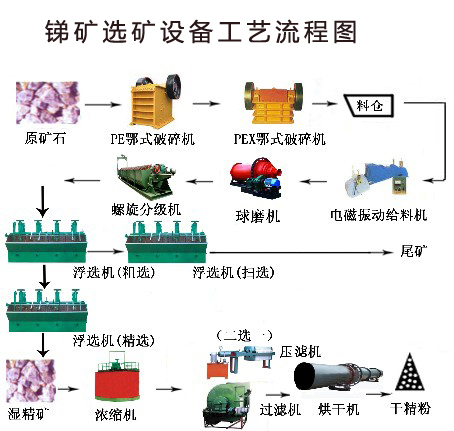 锑矿石的选矿以浮选为主,但是对于结晶较粗的辉锑矿,黄锑华等锑矿石的选矿,也是可以采用重选的方法选矿提纯的。而氧化锑矿石则必须采用重选法提纯。