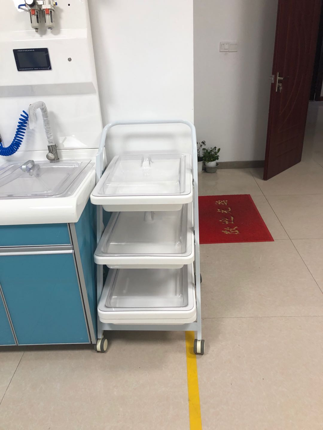 3由一次压模成型的高分子托盘、全钢烤漆车体、静音脚轮组成,具有耐腐蚀、不沾水、车行顺畅、取放方便等优点;