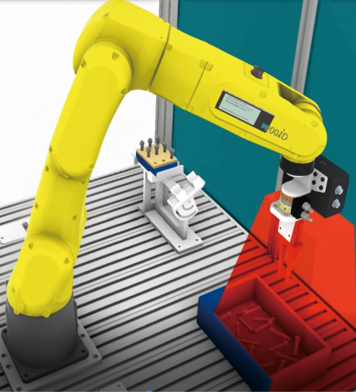 火花塞和螺钉无序的摆放在料框里,通过3D视觉识别定位,引导机器人自动完成上料,可以调整工件的朝向保证一致性;代替人工,降低成本,提高设备稳定性,实现自动化生产。
