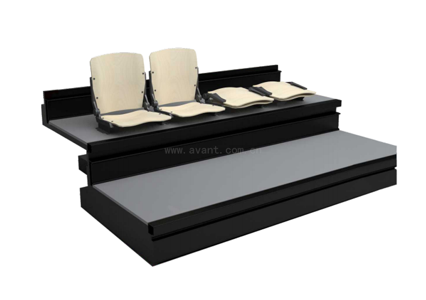 在每排床架上都设置一个高度为看台层高一半的半步台阶,台阶采用18mm桉木旋切耐水层压胶合板加工而成,上表面贴了一层0.5mm高耐磨防火防滑PVC面层,与踏板上的PVC相同,使得整个看台的协调、一致,踏步表面可选配地毯或木纹板,增加了整个看台的档次。