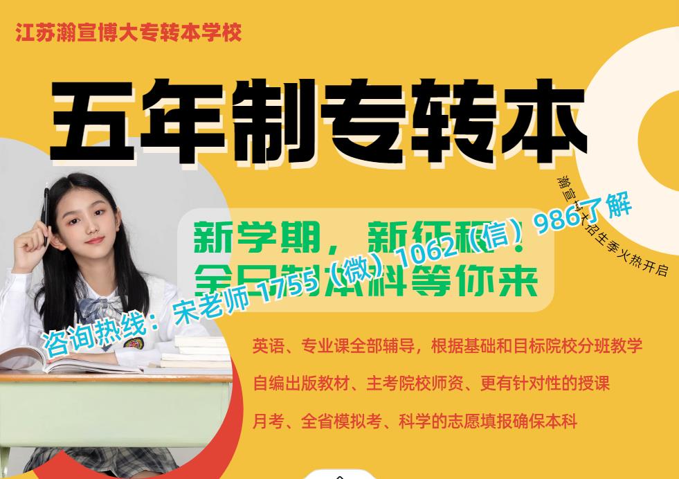 江苏瀚宣博大专转本学校专业从事五年制专转本英语和专业课培训辅导16年,全日制上课模式,高考式复习管理,严格的上下课打卡制度,提高学员上课的积极性和主动性,拥有强劲的师资力量,详细精准的内部.学习资料,配套的课堂练习知识讲解,让考生及时掌握当节课所学内容并加深理解和印象,每月的摸底小测试,及时掌握学员当月所学情况,进行针对性的辅导和查漏补缺,发挥优势,弥补短板,考前更有历年整理的专项训练试卷集、习题册等,针对性刷题,提升应试技巧,提高解题速度,确保考取本科,具体课程详情及预约试听课联系宋老师1755(微)1062(信)986了解。