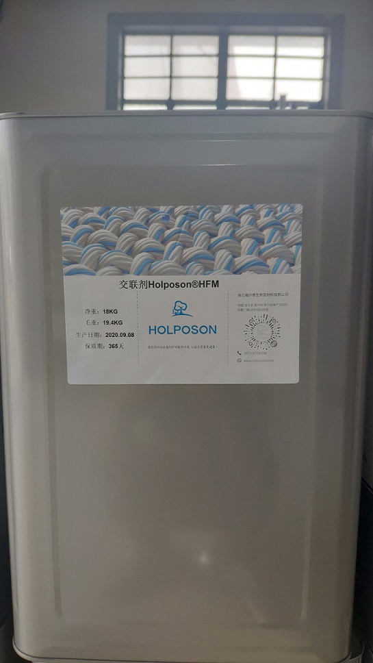 交联剂HOLPOSON® HFM-2是具有多分支多官能末端封闭型异氰酸脂基团,结合拼用织物功能整理剂经过加热处理提高交联性能效果。尤其是与织物防水剂和抗菌整理剂等其它弱阳离子及非离子乳液相溶性良好。加热处理时不会发生甲醛。