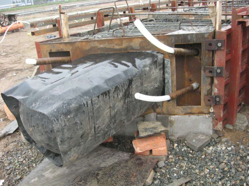桥梁充气芯模是一种可膨胀、收缩的圆柱袋子,由橡胶与纤维加强层硫化而制成,具有很高的抗张强度,弹性和气密性,用来形成混凝土构件的空腔,在制造空心构件时,将它放入中间,并充入压缩空气,充气膨胀后具有足够的强度来承受混凝土的压力,能代替原有的木模、竹模、钢模,打开阀门气囊即收缩,并可以从空腔中抽出气囊。它使用简便,经济耐用,可以多次重复使用,未充气能柔软收缩,任意折叠、卷曲,适用于钢筋混凝土构件抽孔,包括桩、屋架、屋面板柱、梁、建筑工程,水利工程(船坞、船台、码头)。