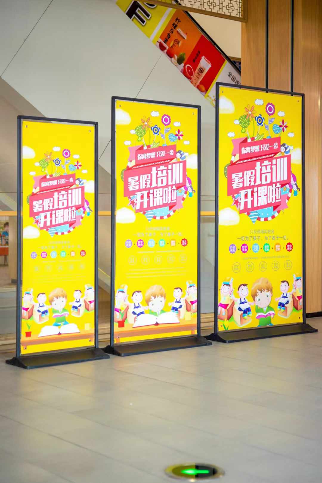 采用铁合金材质打造框架,承重力强且不易倾倒,底座厚度可达4.5mm,搭配防滑橡胶垫,在商场入口、活动现场等人流密集区域也能稳定站立。支持双面画面印刷,可同时吸引双向受众目光,尺寸涵盖80x180cm至120x240cm多种规格,适配产品推广、活动导览等多元需求。