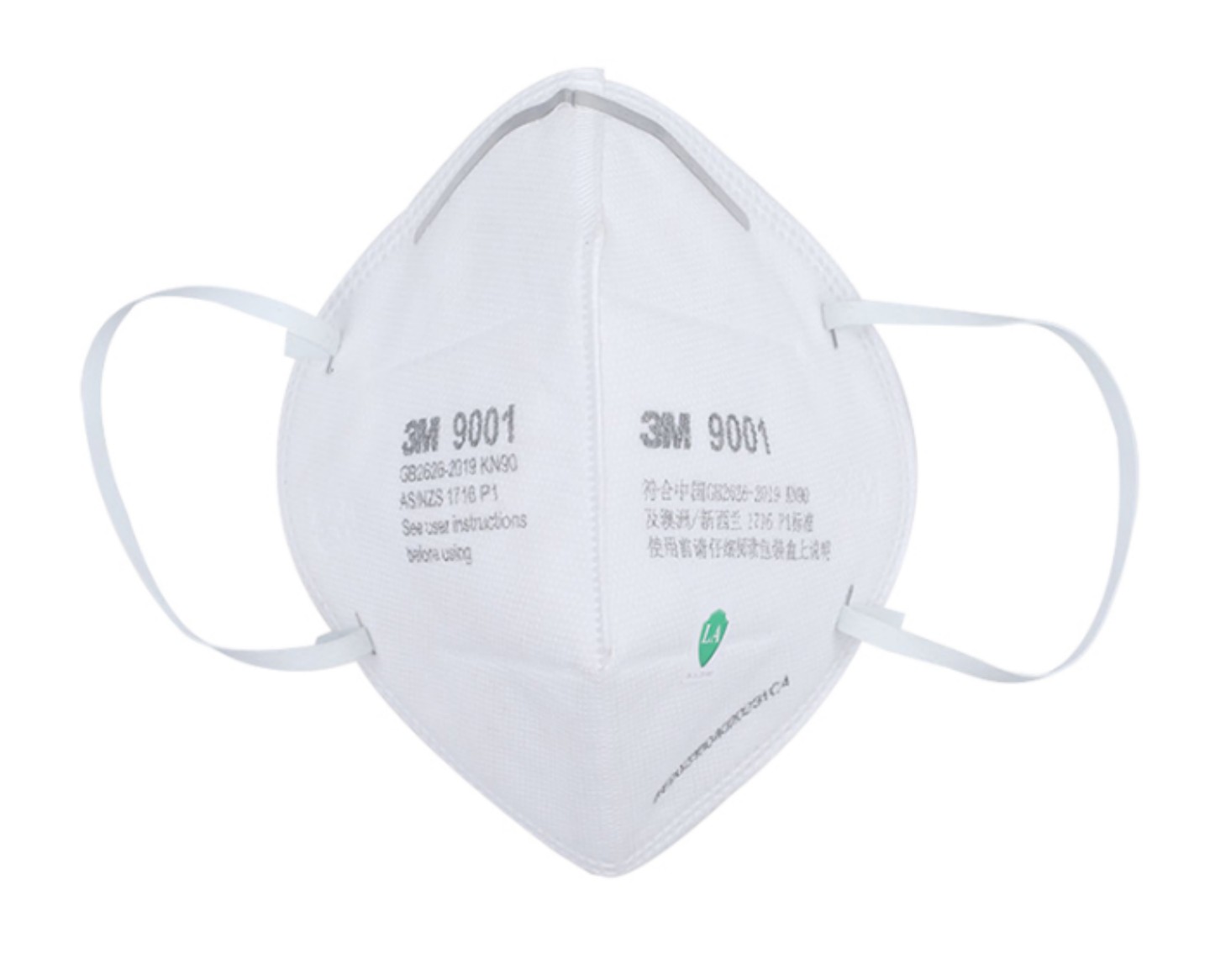 3M9001环保包装折叠耳带式防尘口罩;颜色:白色;呼气阀:无;符合国标GB2626-2019。
