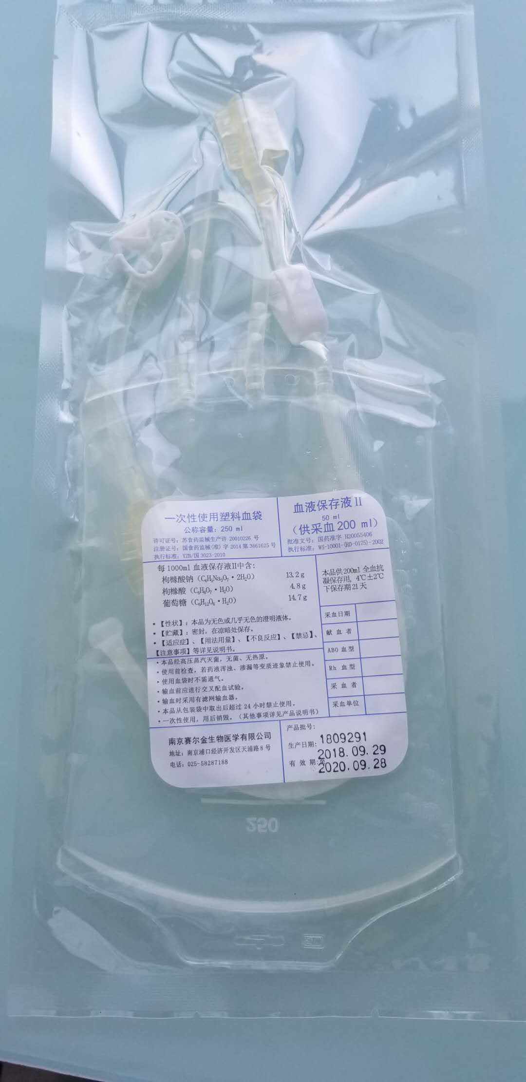 规格容量:250毫升,其中50毫升保存液,采200毫升血