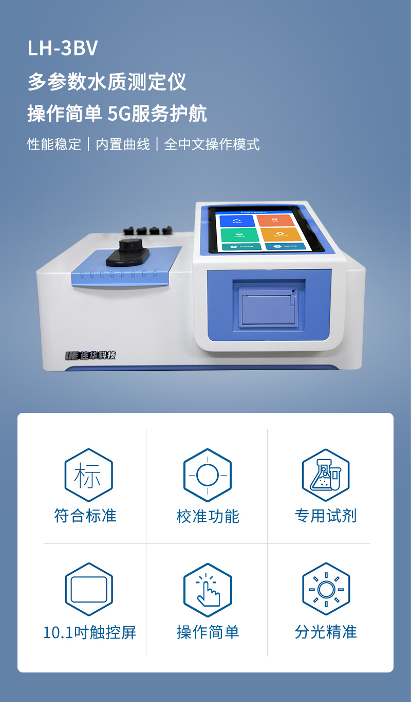 2. 本机设计符合COD-《HJ/T399-2007》、氨氮-《HJ535-2009》、总磷-《GB11893-89》、总氮-《HJ636-2012》标准,可作为水质检测实验室的常规使用仪器。