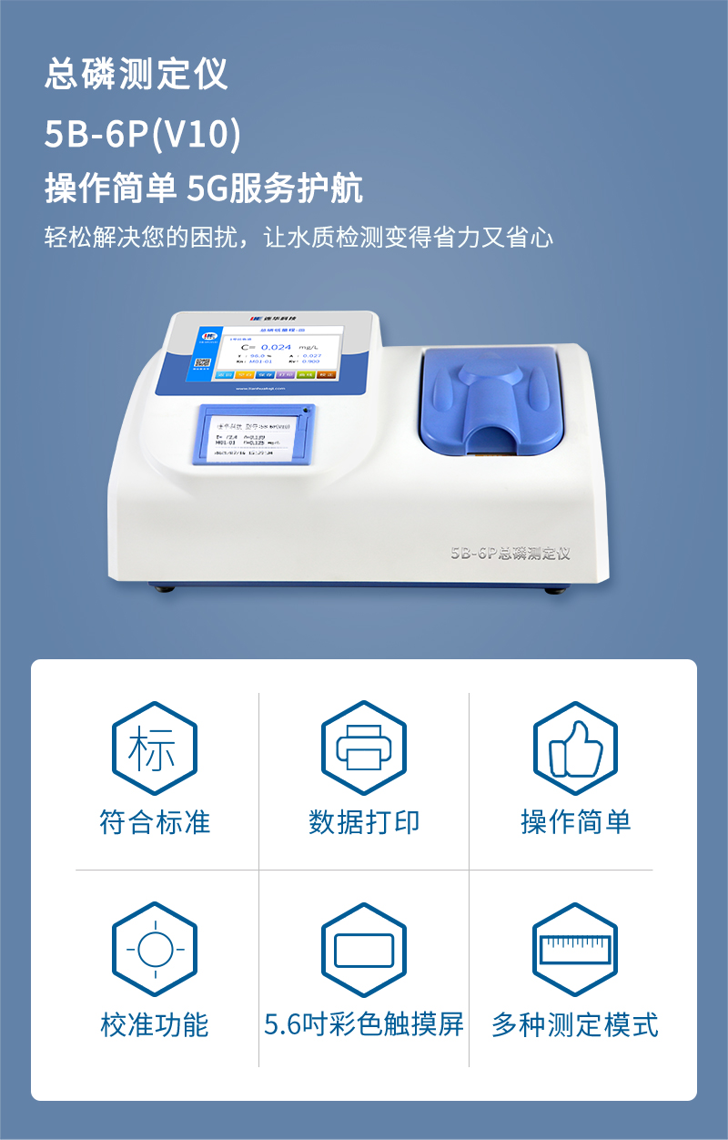 5B-6P(V10)总磷测定仪为实验室智能型测定仪,精度高,寿命长,更稳定。本仪器可根据水样浓度的高低选择不同的测量方式,各个测量项目可一键切换;同时支持比色皿(池)和比色管两种比色方式;内置多条标准曲线,用户可根据需求进行选择;兼具智能数据分析功能,图表、列表显示数据,分析一目了然;高清晰度彩色液晶显示屏,中文显示界面,人性化操作提示,使用更简单。能够广泛的应用于各种行业(工业废水、城市污水、生活污水及江湖流域地表水)废水的检测。可适合不同用户的多种需求,可在化工、石油、焦化、造纸、冶金、酿造、医药等工业废水及各种生活污水监测应用。