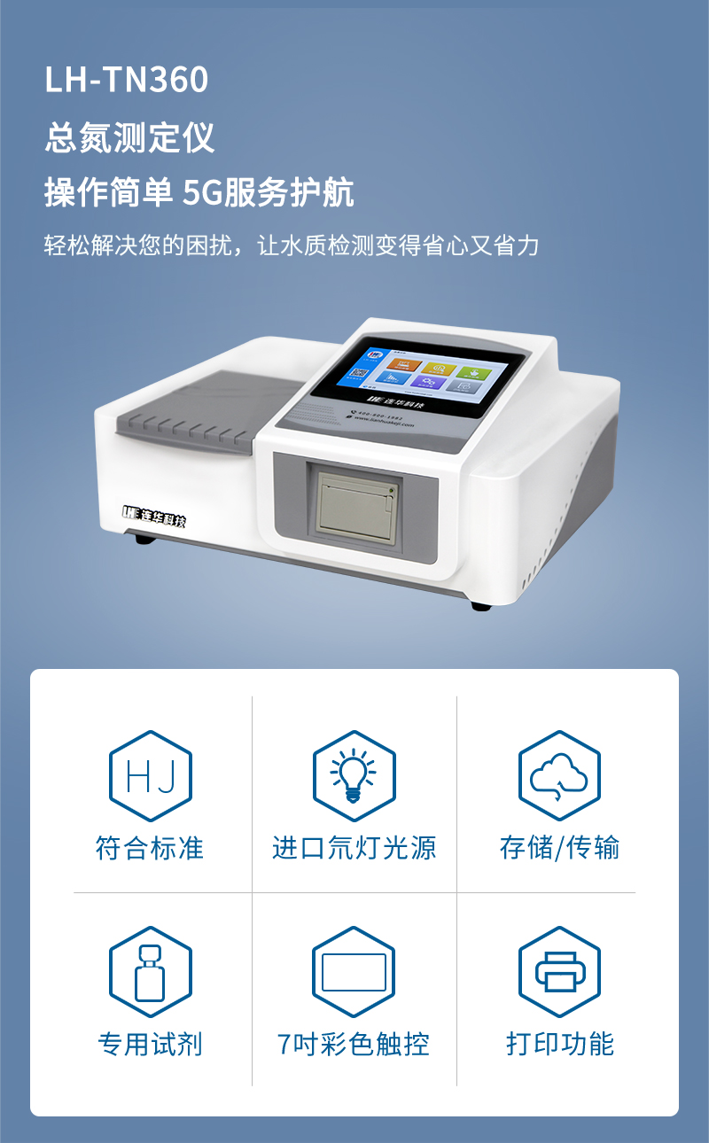 总氮是环境保护污水处理中重要的一个检测项目,LH-TN360总氮测定仪是速度快,成本低的检验水质中总氮含量的一款智能仪表。实现总氮紫外法检测简单化、智能化、标准化,是一款国产性价比超高的总氮检测国标仪器。