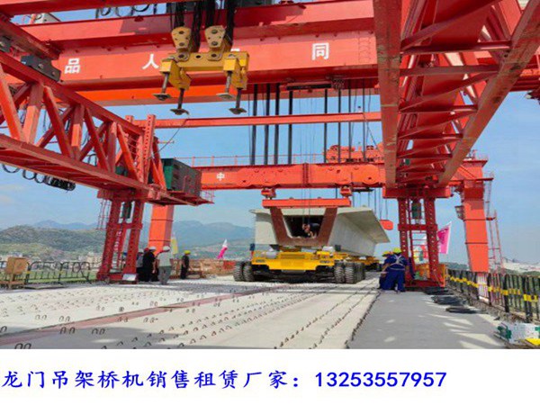 5、将两台天车停在后液压支腿上方,调平主梁,准备架桥机过孔;