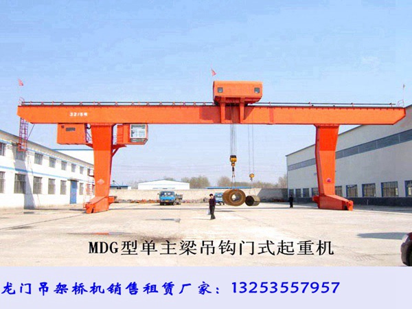 山东枣庄龙门吊销售厂家生产的MDG型单主梁吊钩门式起重机技术参数:本起重机额定起重量一般在5t-32t/5t;整机跨度(起重小车的运行距离)18m-35m;起升高高一般为10m、11m;工作制度为中级;起升速度9.82-12.75m/min,小车运行37.5-39.7m/min,大车运行39.5-43.3m/min。与双主梁通用门式、桁架门式起重机相比,整体刚度要弱一些。因此,当起重量Q≤50t、跨度S≤35m时,可采用这种形式。