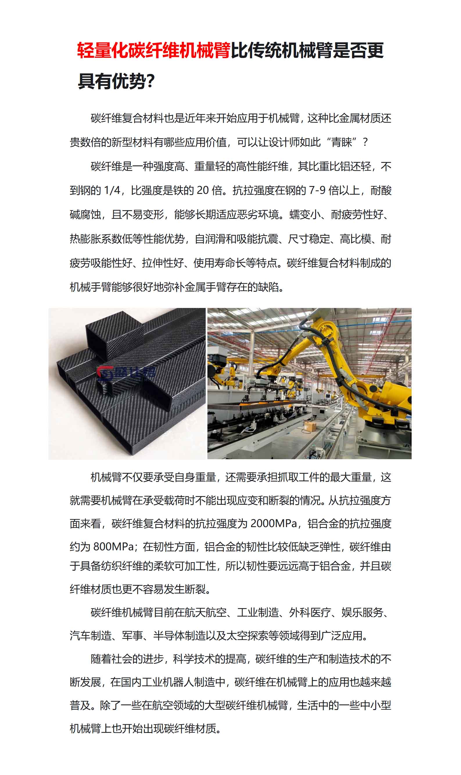随着社会的进步,科学技术的提高,碳纤维的生产和制造技术的不断发展,在国内工业机器人制造中,碳纤维在机械臂上的应用也越来越普及。除了一些在航空领域的大型碳纤维机械臂,生活中的一些中小型机械臂上也开始出现碳纤维材质。