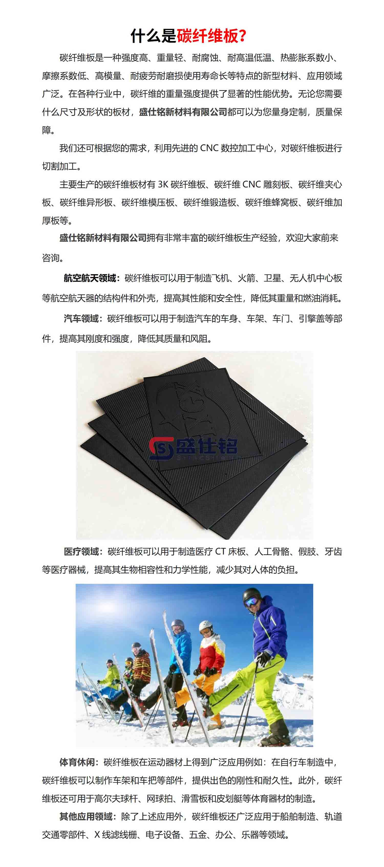 碳纤维板是一种强度高、重量轻、耐腐蚀、耐高温低温、热膨胀系数小、摩擦系数低、高模量、耐疲劳耐磨损使用寿命长等特点的新型材料、应用领域广泛。在各种行业中,碳纤维的重量强度提供了显著的性能优势。无论您需要什么尺寸及形状的板材,盛仕铭新材料有限公司都可以为您量身定制,质量保障。