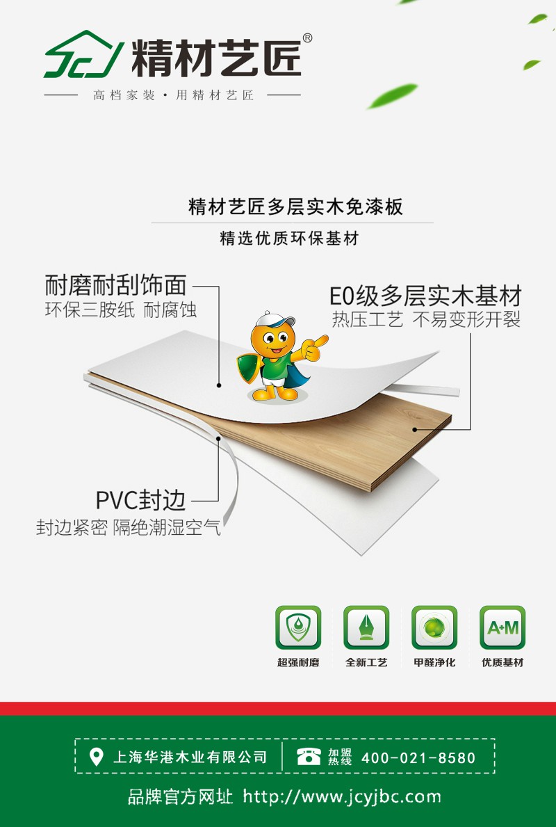 “精材艺匠”隶属于上海华港木业有限公司,是一款以原生态为理念,推动“装修没味儿”新主张的高档家装木板品牌。专注家装木板20年,产业链覆盖:家居地板、人造板、衣柜、木门、家居配套五金、智能线条、全屋定制等多个类别,产品销售网络覆盖全国各地。并推出精材艺匠定制配材:家具板材、同色PVC膜、配套线条、封边条、配套五金、移门、平开门、门套等家具工厂生产所需产品。