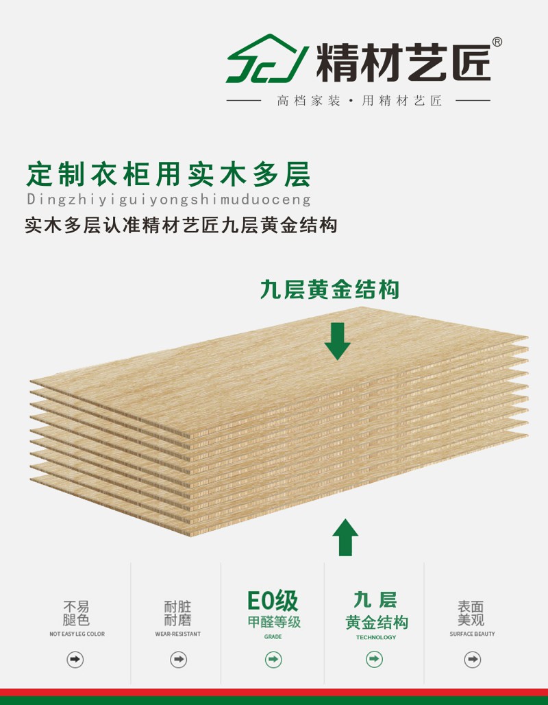 实木多层板,又被称为胶合板,是由多层实木薄板贴合而成的。根据层数划分,可分为三合板、五合板、九合板等。衣柜定制用实木多层,实木多层认准精材艺匠九层黄金结构。