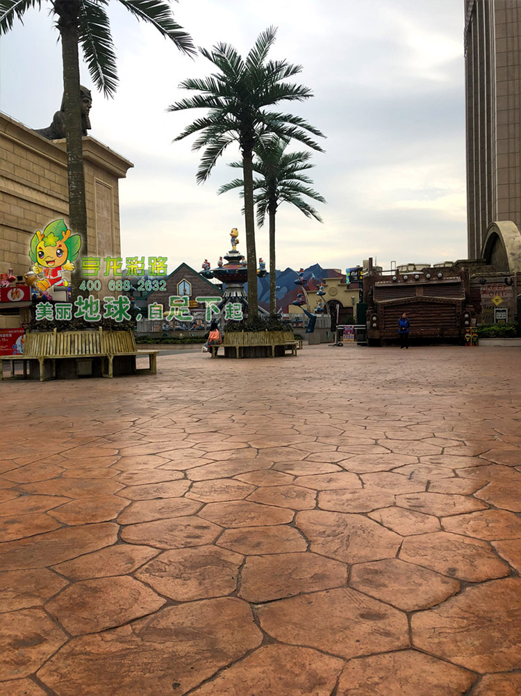 彩色艺术混凝土压模地坪工艺_艺术仿石压印系统_彩色装饰混凝土压模地坪是一种新颖的路面铺设材料.它具有施工方便,自然美观,立体感强,色彩层次丰富,坚固耐久,保养维修简便等优点.避免了地砖所常有的易于松动,高低不平,缝隙长草等缺点.融合了水泥地之坚固和天然石材之美观