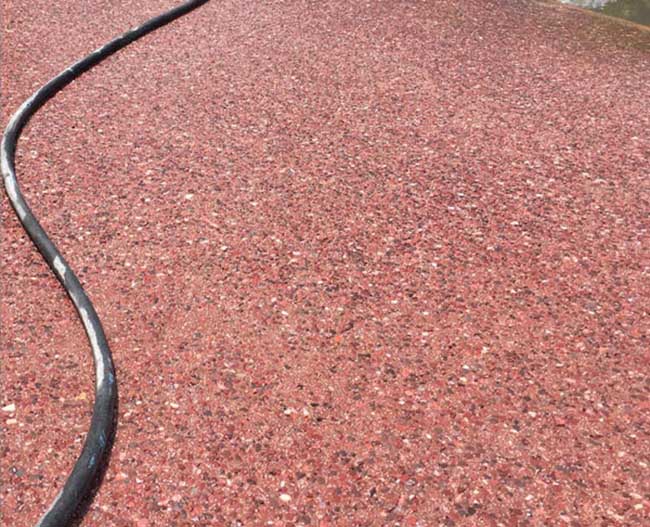 聚合物砾混凝土是在混凝土搅拌时加入聚合物增效剂,优化砾石混凝土配合比,在聚合物混凝土提浆抹平或刮平表面,在聚合物混凝土表面撒播各种不同品种、不同规格的各种骨料, 在出现泌水时,使用长柄镘板或刮板抹子将表面抹至平坦及光滑。待聚合物混凝土有一定强度,对聚合物混凝土进行饰面洗刷,以或多或少或深或浅的露出之前撒播的骨料,呈现现出各种场景的砾石景象,以达到预期的效果,聚合物砾石混凝土地坪。