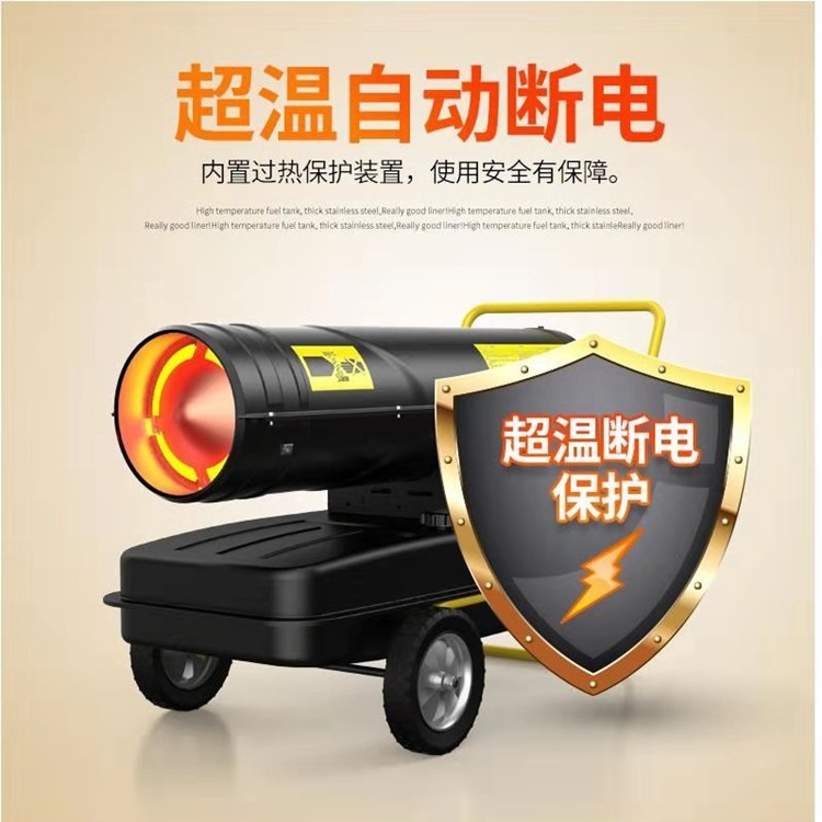 燃油暖风机升温迅速,燃烧筒材质为钛合金,不容易烧坏,尺寸加宽加大,风量更大,升温更快,非常适合大面积的工业场所使用。舒适度高,柴油暖风机是直接对空气进行加热的,对空气加热是最舒服的一种方式,不会让空气中的水分大量流失,就不会太过干燥。使用成本低,因为柴油暖风机一般都有外置控温器,能够精准智能控温,迅速升温到设定温度后,开启恒温模式,减少燃油消耗,省电也省油,使用成本大大降低。柴油暖风机一般防护等级都比较高,双层防过热保护,停机保护,防水防震。燃烧仓的隔热层有四层,隔热绝缘性大大提高了,而且有专门设计的绕线架,避免线路错乱,节省空间。
