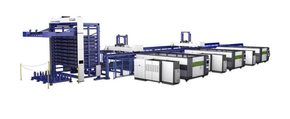 大族激光智能装备集团坚根据企业智能化发展需求,研发出激光切割机的配套装置——ALU4020系列自动上下料系统及多列料库生产线,其中ALU系列自动上下料系统能与三台及三台以上激光切割机联接,形成激光切割柔性生产线,能实现20mm以内中厚板材的自动切割加工。