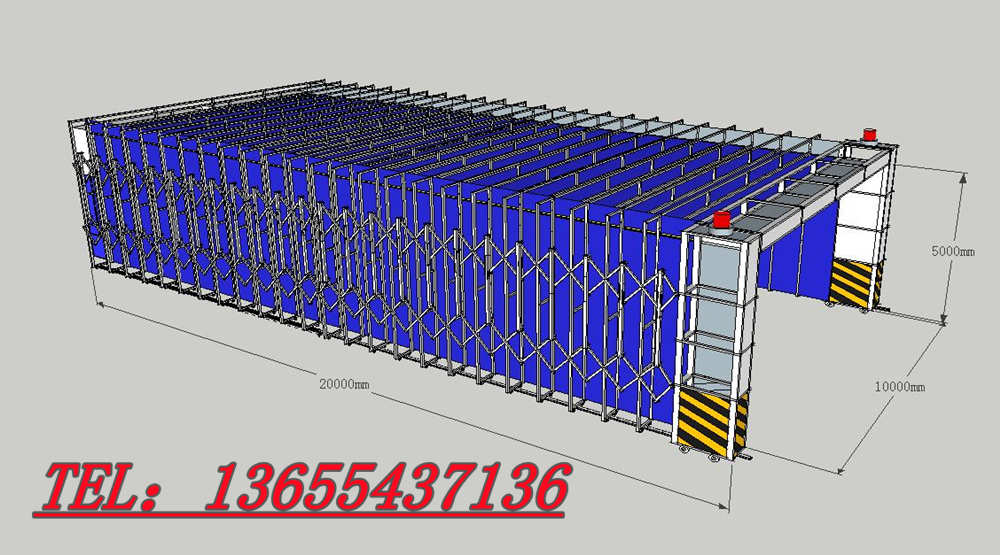 伸缩式喷漆房采用活动式框架结构,内衬玻璃纤维防火篷布,通过进出口门头处的驱动电机,通过轨道带动整体结构进行伸缩运动;非工作时间可将喷漆房整体折叠,***节省了车间场地,作业时根据实际情况调节入口处卷帘,控制补风,从而提高作业时产生漆雾的回收效果。