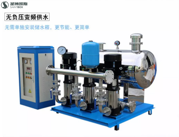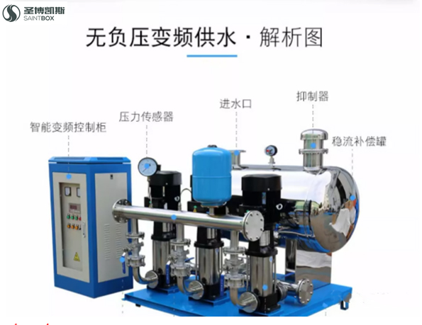 无负压供水设备由气压罐、水泵及电控系统三部分组成,其突出产品的特色是,不需建造水塔,赞助小、占地少,布置灵活,建成投产快。采用水气自动调节、自动运转、节能与自来水自动并网,停电后仍可供水,调试后不需看管。广泛用于企事业单位、住宅区及农村的生产、生活、办公供水。适用于供水户在5000户以内,日供水量在3000 m³以内场所,供水高度达100米以上。一般设在地面或地下室。有自来水的单位,使用无负压供水设备可以调节高峰用水量,增加水压,能在高峰用水时,满足大面积用水和高楼层用水。没自来水的单位、工厂或农村,只需将设备接通水源电源,即可得到稳定的水量水压,满足用水需要。该设备与其他老式供水设备相比节约占地3~16倍,比建水塔节约赞助15%~60%。设备体积小,组装、设备安装调试方便,运输及设备安装工期短,无负压供水设备保护功能全,运行安全可靠,操作方便。设备主机采用变频调速器,自身具有欠压、过压、过流、过载、短路、过热、失速防止等保护主要功能,无故障运用达10万小时以上。设备配电控制部分,采用智能化控制原理,操作方便实用,设备工作状况一目了然,便于非专业人员很快熟练掌握。